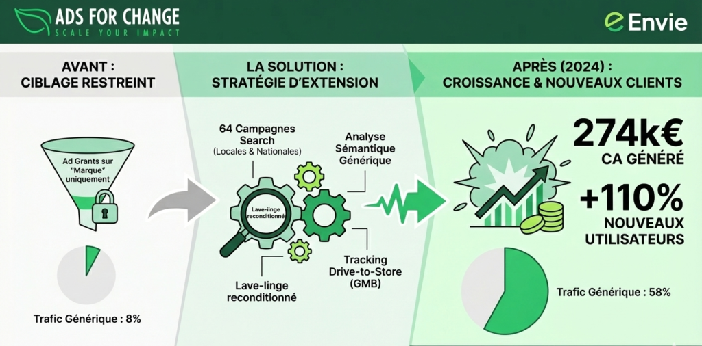 La Fédération Envie avait un objectif ambitieux : développer son chiffre d’affaires en magasin et en ligne sur tout le territoire, tout en s’appuyant sur une stratégie d’économie circulaire. Cependant, leur compte Ad Grants souffrait d’une visibilité limitée, ne diffusant que sur le nom de la marque, ce qui empêchait d’attirer une nouvelle clientèle non initiée au réseau Envie.Lorem ipsum dolor sit amet, consectetur adipiscing elit. Ut elit tellus, luctus nec ullamcorper mattis, pulvinar dapibus leo.